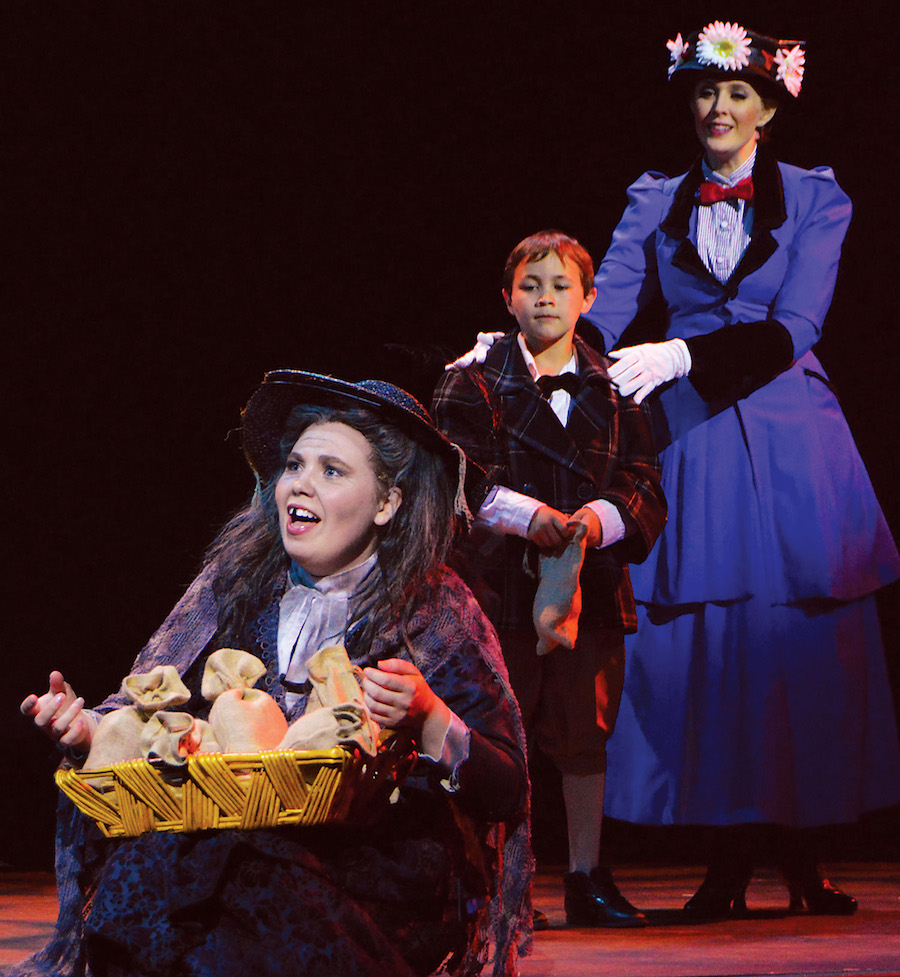 The Bird Woman (Chelsea Leis), Logan Sejas (Michael Banks), and Cara Statham Serber (Mary Poppins)