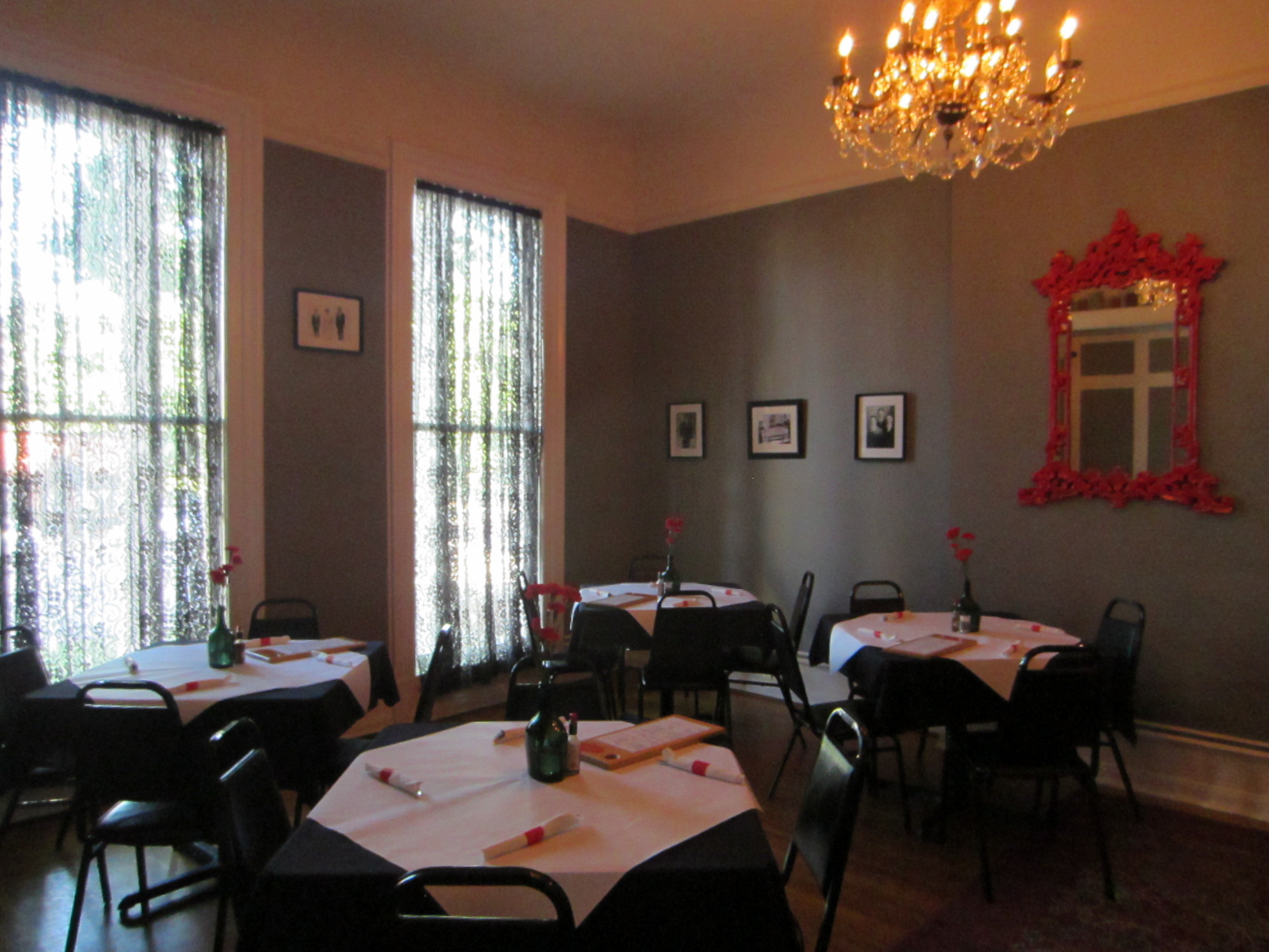 Located at 1113 Parrett Street, Sauced! is an Italian American restaurant within a renovated historic home that was originally built in 1877. From the moment you walk in, everything is as it should be. From the black, white & red color palette to the beautiful chandeliers and stained glass windows, it is a visually stunning space that is warm, inviting and cozy.