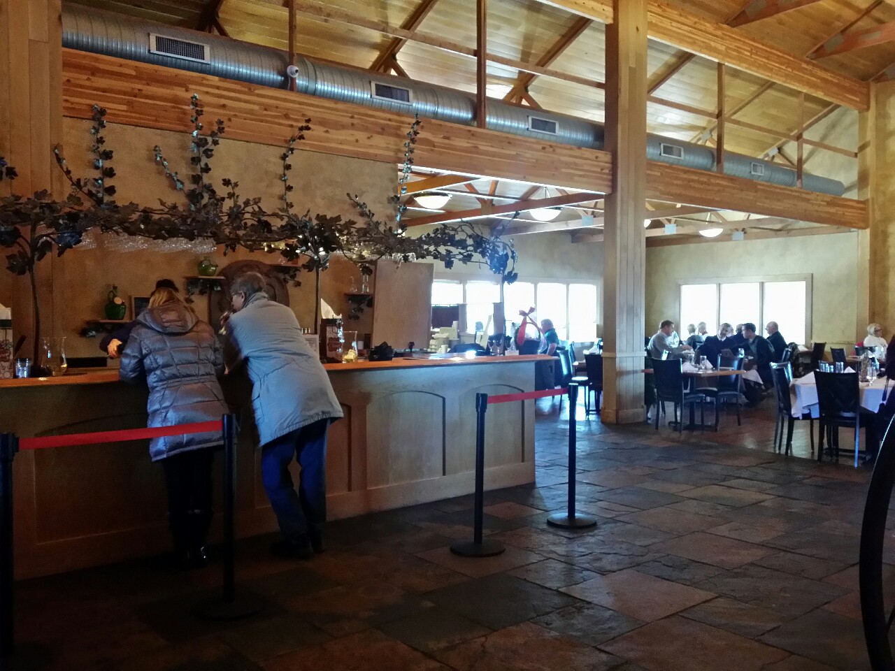The building is beautiful (I love the iron work at the wine bar.), the atmosphere relaxed and you can look down into the winery from the dining room.