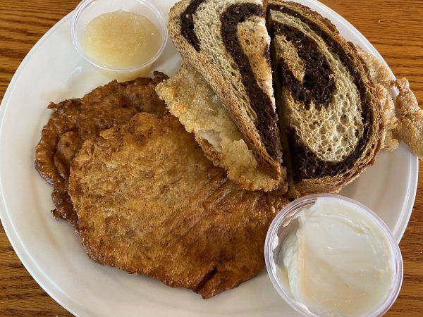 Items on the lunch menu had a choice of sides. I got a schnitzel sandwich (the schnitzel was perfect, by the way) and selected a potato pancake for the side (I was happy that it came with two), served the traditional way with applesauce and sour cream. I also tried a bit of hubby’s ribeye soup and promptly regretted not ordering a bowl of my own.