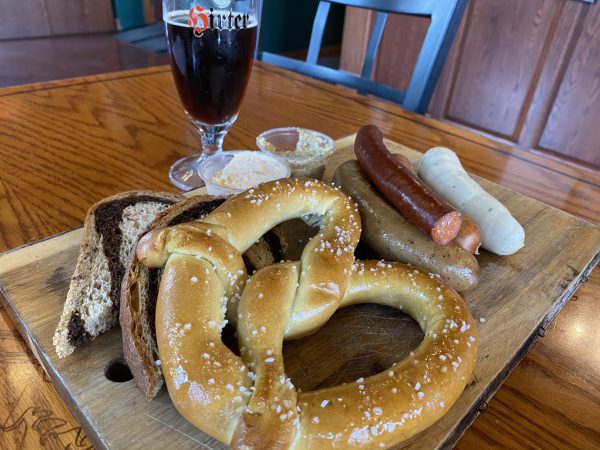 The small hot wurst platter appetizer includes four sausages, bread, and a giant pretzel.