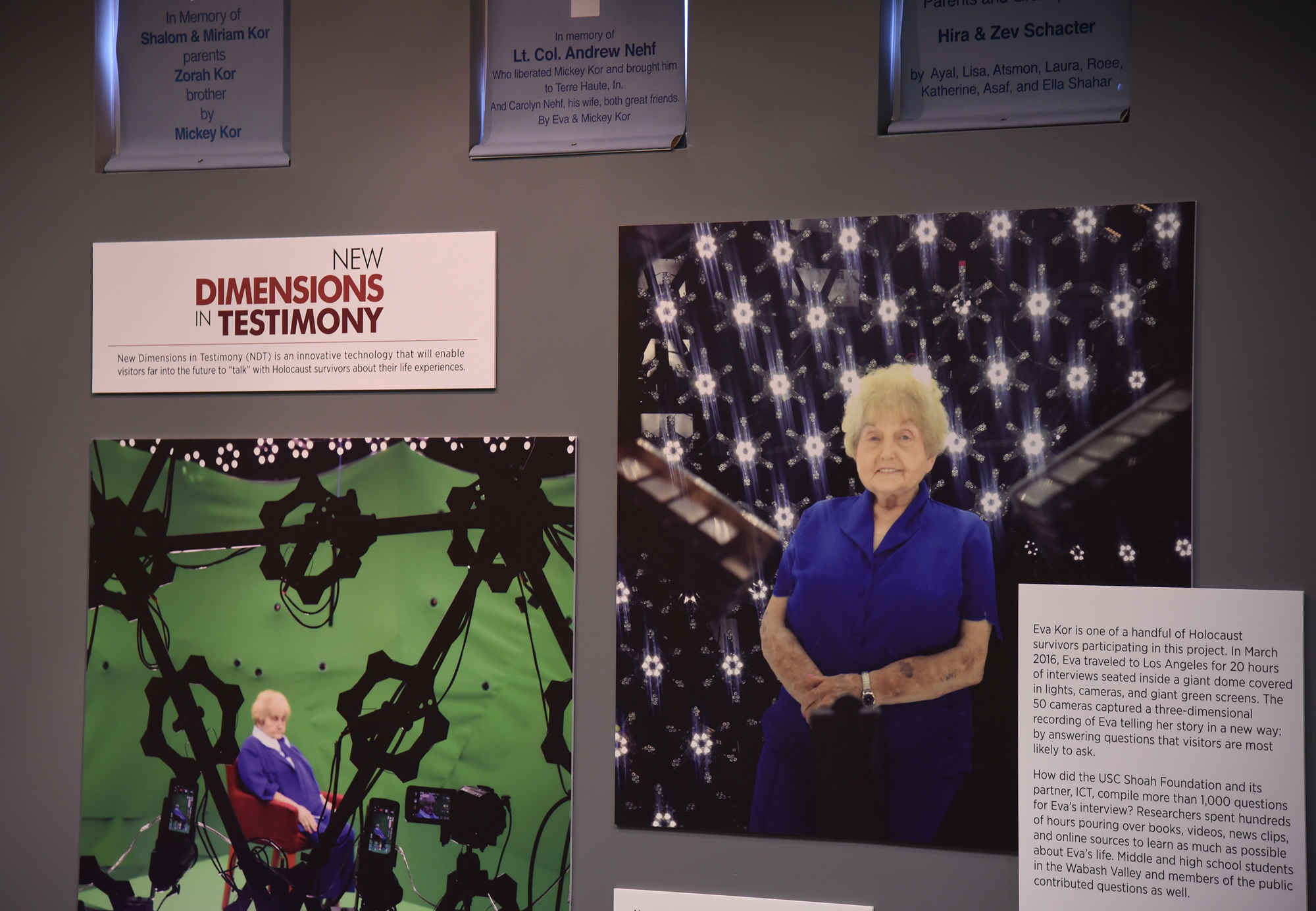 “One power left, I could use to help me cope was the power of forgiveness. I never went back,” Kor says. “If there’s nothing you can change you have two choices: be angry or forgive.” An interactive “Dimensions in Testimony” installation allows visitors to ask an ‘Eva’ hologram questions and hear her testimony. The installation was developed by the USC Shoah Foundation to preserve and share Holocaust survivor stories.