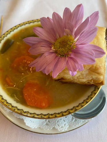 Next, the food. Oh my, the food was superb! There’s not a huge variety, but that doesn’t matter. What is on the menu is so amazing. We always order different entrees so that we can try different things. That day we ordered the Chateau Earl Gray, which is reminiscent of a very high-quality pot pie. It had chunks of chicken breast, broccoli and cheese wrapped in a phyllo purse and drizzled with their champagne sauce and a side of cranberry relish.